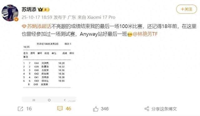 10月17日,苏炳添在社媒发文,称自己已经结束了生涯最后一场100米比赛。即将到来的全运会,他将会站好最后一班岗。